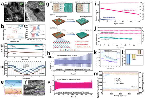 - Li, Y.; Feng, X.; Lieu, W.Y.; Fu, L.; Zhang, C.; Ghosh, T.; Thakur, A.; Wyatt, B.C.; Anasori, B.; Liu, W.; et al. MXene-Based Anode-Free Magnesium Metal Battery. Adv. Funct. Mater. 2023, 33, 2303067. [Google Scholar] [CrossRef]