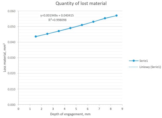 In order to determine the influence of the relationship between the depth of insertion of the workpiece into the tool, a series of numerical analyses were carried out, where the above-mentioned parameter was modified. The result of the series of analyses was the amount of material that was worn away in 50 s, which corresponded to the approximate length of the operation in production conditions. Based on the obtained results, it can be stated that this relationship was linear. The calculated coefficient of determination (R2) for the obtained dataset was 0.998, which means a linear nature of the relationship. The resulting deviation may result from errors in numerical calculations.