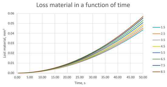 When analyzing the amount of material worn off depending on the duration of the process, one can notice the nonlinear nature of this relationship (Figure 13). The observed nonlinear behavior of material lost in the time domain can be explained by a change in the contact area. At the beginning, the contact is represented as contact between points and lines, while with the progressive removal of the material of the bristle, it is changed to line to line contact.