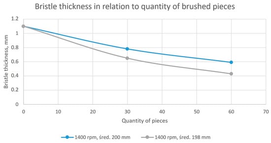 As part of the work on selecting the optimal parameters of the technological brushing process (i.e., such parameters that, while maintaining the desired quality of the produced parts, translated into the longest possible brush operation time), a linear relationship was observed between the depth of the part’s insertion into the tool and the amount of abrasive material worn (reduction of bristle thickness). During the test phase of selecting technological parameters, all technological conditions, like used workstation, used tools, workpieces, and environmental conditions, were exactly the same as during standard production process. With respect to this fact, all test results in this paper represent industrial results of deburring technological operation, which is one of the stages of the real production process. The results published in [26] are presented in Figure 14: