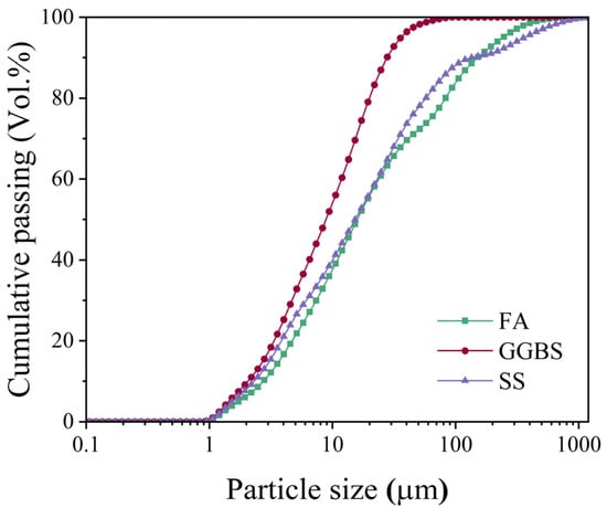 The raw materials utilized in this study included Grade S95 ground granulated blast furnace slag (GGBS), Class F fly ash (FA), and steel slag (SS) powder, all sourced from Ningbo, China, with respective specific surface areas of 286 m2/kg, 410 m2/kg, and 325 m2/kg as measured by the Blaine air permeability method. Chemical composition analysis conducted via X-ray fluorescence spectroscopy (XRF) revealed the oxide constituents presented in Table 1, while particle size distribution characteristics determined by BT-2002 laser diffraction analysis are illustrated in Figure 1.