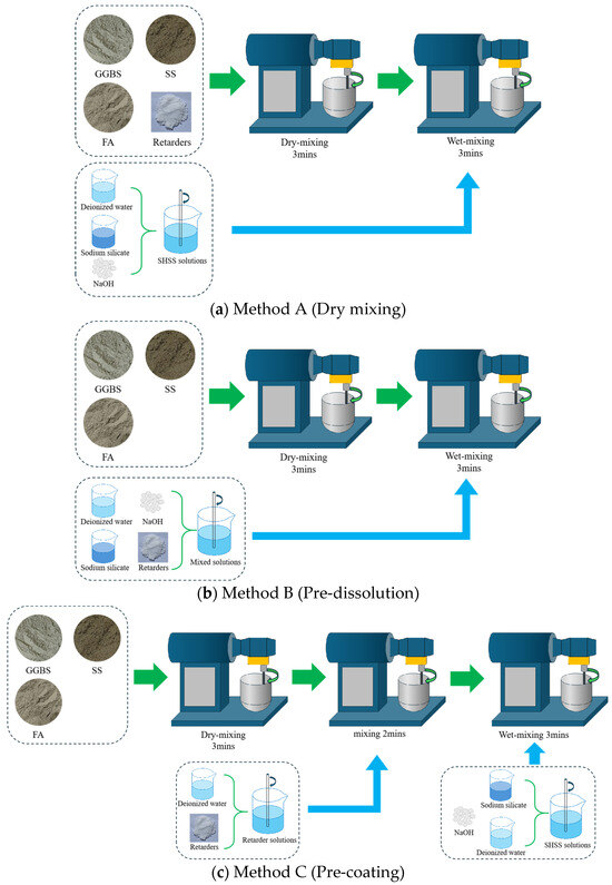 Three mixing methods were performed: (A) dry mixing, (B) pre-dissolution, and (C) pre-coating. Method A involved initial dry mixing of the precursor with BaCl2 powder for 3 min followed by 3 min wet mixing with the alkali activator solution. In Method B, BaCl2 powder was first dissolved in water to form a solution, which was then blended with the alkali activator; the precursor was dry-mixed for 3 min before incorporating the blended solution through 3 min wet mixing. Method C commenced with BaCl2 solution preparation, followed by 3 min dry mixing of the precursor, 2 min wet mixing with the BaCl2 solution to ensure complete particle coating, and a final 3 min wet mixing with the alkali activator solution. The detailed mixing process is shown in Figure 2.