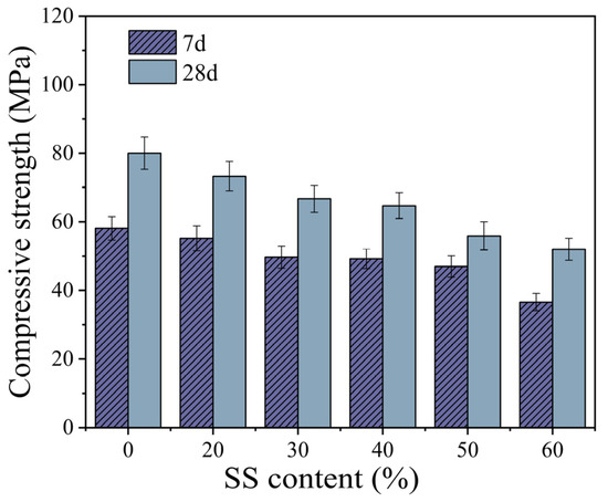 As shown in Figure 4, the compressive strength of the TGM decreased with increasing steel slag (SS) content. Within the SS content range of 0–30%, the 7-day and 28-day compressive strengths of the samples decreased by 14.5% and 16.6%, respectively. When the SS content reached 60%, the 7-day and 28-day compressive strengths were reduced by 37.0% and 35.0%, respectively, compared with the control group. Additionally, as the SS content increased from 30% to 40%, the compressive strength showed only a slight decline—1.0% at 7 days and 3.0% at 28 days. However, within the range of 40–60% SS content, the 7-day and 28-day compressive strengths decreased by 25.6% and 19.6%, respectively, indicating that excessive SS incorporation significantly impairs the mechanical properties of geopolymers, particularly their early-age compressive strength. These results are consistent with findings by Song et al. [9], who reported that, as SS content increased, the compressive strength of SS–FA binary geopolymer decreased significantly, with early-age strength development being more adversely affected.