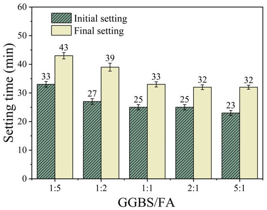 Figure 5 shows the effect of the GGBS/FA mass ratio on the setting time of the samples. As shown in the figure, when the SS content is fixed at 40%, the influence of the GGBS/FA mass ratio on the setting time exhibits a two-stage pattern. As the GGBS/FA ratio increases from 1:5 to 1:1, the initial setting time decreases from 33 min to 25 min (a reduction of 24.2%), and the final setting time decreases from 43 min to 33 min (a reduction of 23.3%). However, when the ratio continues to increase to 5:1, the change in setting time slows down, with the initial and final setting times decreasing by only 8.0% and 3.0%, respectively. This non-linear response pattern reveals the synergistic effect of material components: GGBS has higher hydration activity than FA and hydrates more rapidly in the early stages [22]. Moreover, due to its high CaO content, GGBS may accelerate the development of C-S-H and C-A-S-H gels, thereby accelerating the setting and hardening of the paste [19].