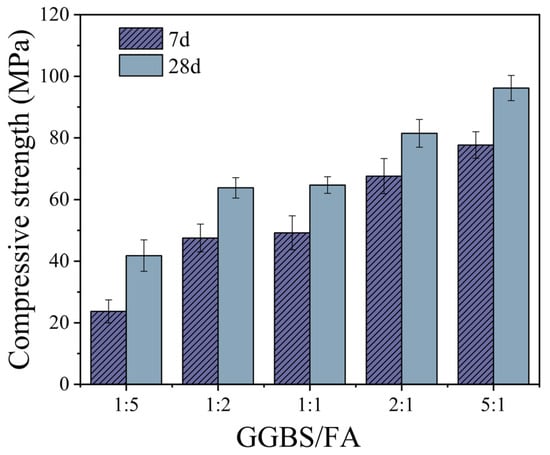 Figure 6 shows the variation in compressive strength of TGM with different GGBS/FA mass ratios. As the GGBS/FA mass ratio increases, the compressive strength of the samples improves significantly. When the GGBS/FA mass ratio increases from 1:5 to 5:1, the 7-day and 28-day compressive strengths increase by 227.8% and 130.1%, respectively. Moreover, at a GGBS/FA mass ratio of 5:1, the compressive strengths at 7 and 28 days reach 77.7 MPa and 96.2 MPa, respectively. These results indicate that the incorporation of GGBS can markedly enhance the compressive strength of ternary geopolymer systems, particularly at early ages. Numerous studies [19,23] have demonstrated that the high CaO content in GGBS promotes the formation of C-S-H and C-A-S-H gels within the matrix. The development of these gels effectively fills the micro-pores generated during the hydration process, thereby accelerating early strength development. Additionally, GGBS exhibits a nucleation effect [24]; higher GGBS contents provide additional nucleation sites, which facilitate the formation of C-S-H and C-A-S-H gels, ultimately contributing to improved compressive strength in geopolymers.