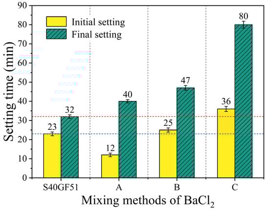 Figure 7 shows the effect of BaCl2 on the setting time of S40GF51 under three different mixing methods. Setting time is a key parameter for evaluating the performance of cementitious materials, with the initial setting time reflecting the early-stage setting characteristics, while the final setting time is closely related to the duration for the material to begin developing strength. Compared with S40GF51, the group with Method A (dry mixing) exhibited a significant reduction of 47.8% in the initial setting time, indicating a marked acceleration effect on the early setting process. The group with Method B (pre-dissolution) showed a slight increase of 8.7% in the initial setting time, suggesting a weak retarding effect. The group with Method C (pre-coating) exhibited a 56.5% extension in the initial setting time, demonstrating a significant retarding effect, which effectively delayed the early setting process of the paste.