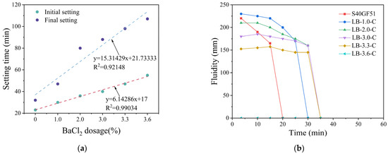 The effect of BaCl2 dosage on the setting time of S40GF51 was observed under the C mixing method, with BaCl2 dosages of 1.0%, 2.0%, 3.0%, 3.3%, and 3.6%. As shown in Figure 8a, with the increase in BaCl2 dosage, both the initial and final setting times were significantly prolonged. Specifically, as the BaCl2 dosage increased from 0% to 3.6%, the initial/final setting times extended from 23 min and 32 min to 55 min and 107 min, respectively, representing an increase of 139% and 234%. This indicates that the incorporation of BaCl2 significantly extends the setting time of S40GF51. In this study, the relationship between the setting time of S40GF51 and the dosage of BaCl2 can be well fitted using a first-order polynomial expression. The coefficients of determination (R2) obtained from the regression analysis indicate a clear linear relationship between BaCl2 dosage and both the initial setting time (R2 = 0.99034) and the final setting time (R2 = 0.92148) of the TGM.