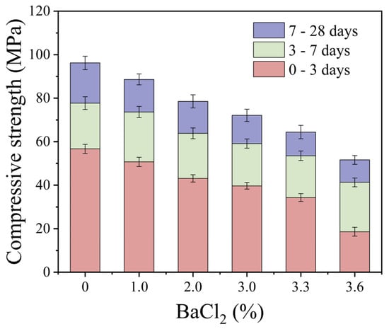 Figure 9 depicts the compressive strength of S40GF51 under various curing times and different dosages of BaCl2. The results indicate a continuous decrease in compressive strength as the BaCl2 dosage increases within the range of 0% to 3.6%. Compared with the control group, the compressive strength of the 3.6% BaCl2 group decreased by 67.2%, 46.8%, and 46.3% at 3, 7, and 28 days, respectively. This suggests that BaCl2 has a more pronounced impact on early-age strength. BaCl2 reacts with Na2SiO3 in the alkali activator to form BaSiO3 precipitates, which adsorb onto the surface of precursor particles, thereby inhibiting their dissolution and obstructing the formation of hydration gels in the initial stages of the reaction. However, even at 28 days, the 3.6% BaCl2 group still exhibited a 46.3% reduction in compressive strength. This continued strength loss can be attributed to the partial consumption of alkali activators by BaCl2, which hinders the dissolution and breakdown of the precursors, subsequently reducing the generation of hydration products. Although the incorporation of BaCl2 may lead to strength reduction in geopolymers, the 28-day compressive strength of the 3.0% BaCl2 group still reached 72.1 MPa.