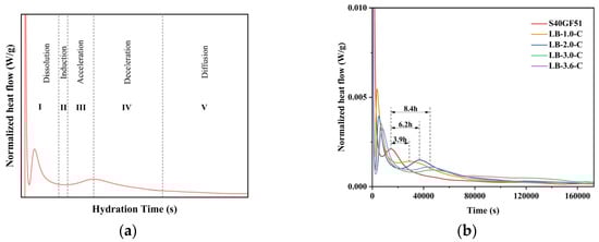The hydration exothermic characteristics of S40GF51 under different BaCl2 dosages are shown in Figure 10. The experimental results are similar to the five stages of the hydration process of alkali-activated slag cement [27] (dissolution, induction, acceleration, declaration, and diffusion stages, as shown in Figure 10a). During the hydration process, the S40GF51 group exhibited two peaks in the calorimetry. The first peak appeared at 220 s (dissolution stage), while the second peak occurred at 14,560 s (acceleration stage). It is noteworthy that the addition of BaCl2 resulted in two calorimetry peaks during the hydration dissolution stage, with the heat release at the first peak being higher than that at the second peak. He et al. [28] studied alkali-activated slag–fly ash–silica fume cement and found that two calorimetry peaks also appeared in the dissolution stage, with the second peak being higher than the first. They pointed out that, when the precursor comes into contact with the alkali activator, Ca2+ ions begin to dissolve, initiating the first calorimetric peak. Subsequently, the Ca2+ ions react with the Si4+ and Al3+ ions dissolved from the precursor, leading to the formation of the second calorimetric peak. However, in their study, the calcium content in the precursor was relatively low, which explains why the second peak was higher than the first. In contrast, the present ternary system is a high-calcium system, and the single peak observed in the hydration dissolution stage of S40GF51 was primarily due to the heat released from the dissolution of CaO. With the incorporation of BaCl2, the BaSiO3 encapsulation layer hindered the dissolution and erosion process of the alkali activator with active components like CaO, leading to a reduction in the peak value of the first calorimetry peak. Meanwhile, the depolymerization–polymerization reactions between the precursor and alkali activator continued slowly, and the dissolved Ca2+ ions reacted with the Si4+ and Al3+ ions in the precursor, forming a second relatively lower calorimetric peak in the dissolution stage. Further studies revealed that, as the BaCl2 dosage increased (1%, 2%, 3%, and 3.6%), the first calorimetric peak value during the hydration dissolution stage gradually decreased. Additionally, the second calorimetric peak was delayed relative to the first peak by 58 min, 80 min, 111 min, and 131 min, respectively. Meanwhile, compared with S40GF51, the acceleration stage was delayed by 3.9 h, 6.2 h, 8.4 h, and 8.4 h, respectively.