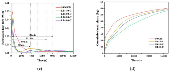 Figure 10d shows the cumulative heat release during hydration. The total heat release increased and then decreased with the increase in BaCl2 dosage, as the incorporation of BaCl2 consumed the alkali activator to varying degrees. After 48 h, the total heat release of S40GF51, LB-1.0-C, LB-2.0-C, and LB-3.0-C slurries were 140.9 J/g, 138.9 J/g, 136.6 J/g, and 133.0 J/g, respectively. Compared with the control group, the total heat release reduction rates for BaCl2-incorporated slurries were 1.4%, 3.1%, and 5.6%, respectively. It can be observed that the 2.0% BaCl2 dosage had almost no impact on the hydration of the geopolymer, while the 3.0% BaCl2 dosage affected the overall hydration of the geopolymer to some extent.