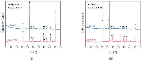 Figure 11 displays the X-ray diffraction (XRD) patterns of the samples after the initial setting and 1-day curing revealed the reaction characteristics of different geopolymers. The gel in high-calcium system geopolymers is mainly amorphous C-A-S-H gel [29]. In an alkaline environment, the Ca-O bond is more likely to break and combine with Si4+ to form C-S-H gel, while the presence of Al3+ promotes the transformation of C-S-H into C-A-S-H [30]. Comparing the LB-3.0-C sample with S40GF51, a diffraction peak corresponding to C-A-S-H gel (PDF # 00-020-0452) was observed at 2θ = 29.5° for both samples. However, the peak intensity for LB-3.0-C was weaker, indicating that the formation of C-A-S-H gel was inhibited. In S40GF51, dissolved Ca2+ or Al3+ (H4AlO4) rapidly reacts with [SiO2(OH)2]2−, forming a large amount of C-A-S-H gel in a short time, accelerating the setting of the slurry [31]. The incorporation of BaCl2 solution leads to the reaction of Ba2+ with SiO32− in the alkali activator to form BaSiO3 precipitates, which consumes the alkali activator, slows down the hydration reaction, and reduces the formation of C-A-S-H gel. However, due to the relatively low amount of BaCl2 added, no significant BaSiO3 diffraction peak was observed in the XRD patterns. It has been reported that there is a synergistic effect in the hydration of steel slag and slag [32], which can produce C-A-S-H gel during hydration, contributing to the improvement of the compressive strength of geopolymers [33]. After one day of curing, no new diffraction peaks appeared in the LB-3.0-C sample, except for quartz and C-A-S-H, indicating that the incorporation of barium chloride does not change the main types of hydration products in S40GF51.