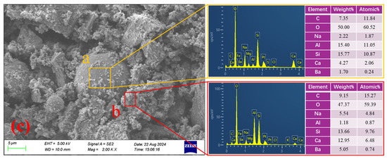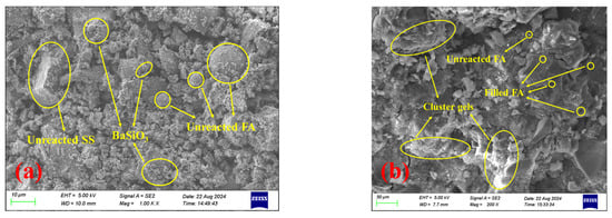 To investigate the retarding mechanism of BaCl2 on S40GF51 under the C mixing method, SEM/EDS analysis was conducted on the initial setting samples of LB-3.0-C and S40GF51. As shown in Figure 12, the microstructure of S40GF51 is dense, containing only a small amount of unreacted FA, indicating a high degree of alkali activation. Additionally, large amounts of needle-like, cluster-like, and amorphous gel products cover and bind residual particles, forming a continuous block gel that reduces porosity and enhances mechanical strength. These gels are primarily composed of C-S-H or C-A-S-H gels formed by the reaction of Ca2+ ions released from CaO in SS and GGBS with the alkali activator. In contrast, the microstructure of the initial setting sample from the LB-3.0-C group is loose and heterogeneous, with a significant amount of unreacted or partially dissolved FA and SS particles, suggesting a lower degree of alkali activation. Furthermore, the precursor particles are enveloped by flocculent gel-like substances suspected to be BaSiO3 precipitates. As shown in Figure 12c, spectrum a has a low Ca content and relatively high and similar amounts of Al and Si, indicating that this particle is unreacted FA. Additionally, the spectrum shows a lack of Ba, which is likely sourced from BaSiO3 precipitates on the particle surface. In spectrum b, there is a higher content of Ba, Si, and O, indicating the presence of BaSiO3 precipitates. The EDS images further confirm the presence of unreacted FA particles and the encapsulation of these particles by BaSiO3 precipitates, indicating that the formation of BaSiO3 hinders the dissolution and hydration of the precursor particles.
