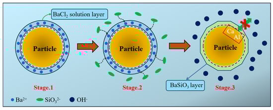 Mechanism analysis indicates that, during the pre-encapsulation stage (Stage 1), the C mixing method involves pre-mixing the BaCl2 solution with precursor particles, which leads to the attachment of the BaCl2 solution to the surface of the precursor particles, forming a BaCl2 solution coating. In the subsequent alkali activation stage (Stage 2), Ba2+ ions from the BaCl2 solution coating preferentially react with the silicate ions (SiO32−) released from the alkali activator, generating an insoluble BaSiO3 precipitate layer (Stage 3). This layer, with a thickness ranging from a nano- to a micron-scale, covers the surface of the precursor particles. The BaSiO3 precipitate layer plays a dual role in regulating the setting behavior. First, as a physical barrier, it effectively reduces the contact area between the alkali activator and precursor particles, delaying the alkali solution’s disintegration effect on the precursor silica–alumina network. Second, the Ba2+ ions consume the alkaline SiO32− ions in the alkali activator, lowering the liquid phase alkalinity of the system, which in turn inhibits the depolymerization–polymerization reaction rate of the precursor particles in the highly alkaline environment.