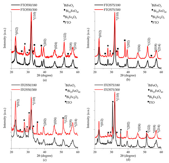 Figure 2 shows the X-ray diffraction patterns of thin films deposited on (a) FTO and (c) ITO substrates at 550 °C, as well as (b) FTO and (d) ITO substrates at 575 °C. Reflections observed at 22.40°, 32.02°, 39.45°, 45.73°, 51.29°, 57.10°, and 57.31° in 2θ angles correspond to the BiFeO3 phase, identified with an asterisk (*). The well-defined peaks indicate high crystallinity, with additional reflections attributed to the FTO substrate in Figure 2a,b and the ITO substrate in Figure 2c,d. Secondary phases are also presented in all samples, including an iron-rich Bi2Fe4O9 phase (mullite structure, Pbam space group, COD #96-900-8149) and a bismuth-rich Bi25FeO40 phase (selenite structure, I23 space group, COD #96-901-1269). In all the diffraction patterns, the mullite structure is identified with a circle (•), and the selenite structure with a diamond (♦). The intensity of these secondary phase reflections increases with deposition time for samples deposited on FTO substrates. It is attributed specifically to a destabilization of the secondary phases with the interaction of argon ions during the cathodic erosion process. Meanwhile, the secondary phase reflection intensity remains unchanged for the samples deposited on ITO substrates.