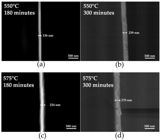 Table 2 shows the thickness of thin films deposited on a glass substrate as a function of deposition time (180 and 300 min) at 550 and 575 °C. Figure 4 presents a cross-sectional image of thin films deposited on glass (a) 180, and (b) 300 min at 550 °C, and (c) 180, and (d) 300 min at 575 °C. As the deposition time increases, the thickness gradually grows. At 575 °C, the thickness increases from 234 nm to 270 nm between 180 and 300 min. The thickness of the thin films increases with both the rise in the heat treatment temperature and the increase in deposition time.