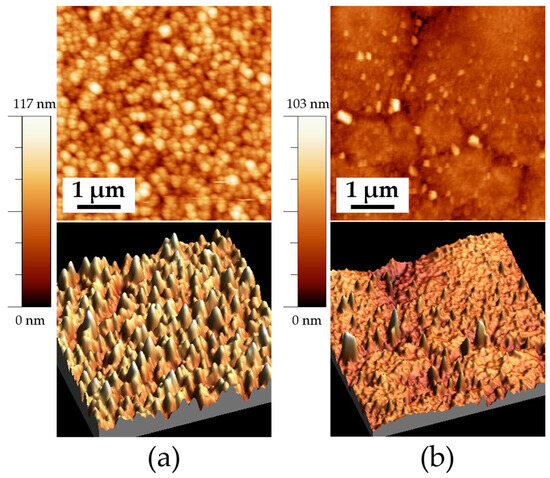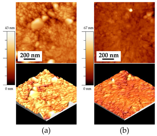 AFM images of the samples deposited on ITO at a heat treatment temperature of 550 °C: (a) ITO550/180 (1 × 1 μm) 2D, and 3D, and (b) ITO550/300 (1 × 1 μm) 2D and 3D.