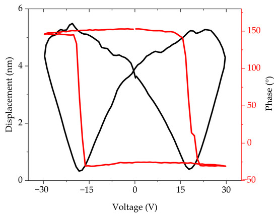 The local piezo-ferroelectric response of the samples was studied by SSPFM-DART mode to obtain the amplitude (displacement) and phase plots in the “Off” state, These measurements are normally presented in this state since this eliminates the long-range electrostatic force influencing the electromechanical response on the samples. Figure 7 shows the plot for the FTO575/300 sample of the amplitude response showing the typical “butterfly” behavior of ferroelectric materials. A d33 value of 2.71 nm/V was obtained from the displacement versus voltage plot, meanwhile, the switching of the ferroelectric domains is observed in the phase plot, confirming the local switching of the domains and corroborating the local piezoresponse of the sample. To compare the effect of the substrate, sample ITO575/300 was studied by the SSPFM-DART mode. The obtained results showed poor piezo-ferroelectric response from the sample, leading to anomalous results in both the displacement and phase plots. This could be attributed to a poor-quality sample or the diffusion of ITO into the thin film as can be observed in Figure 6a.