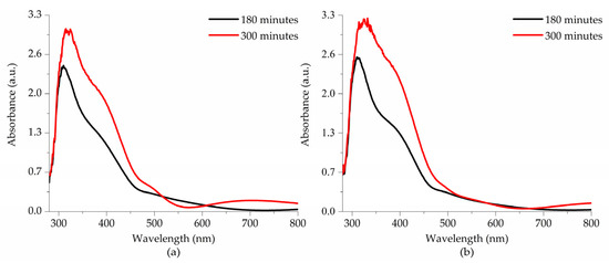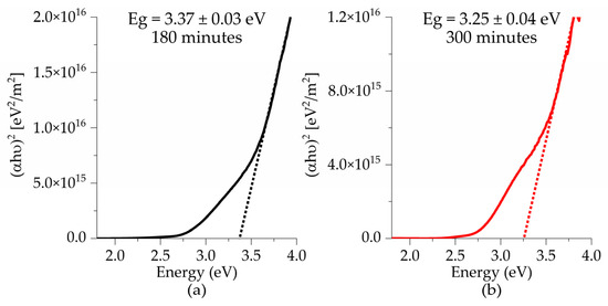 Figure 8 presents the absorbance spectra of thin films deposited on glass substrates and subjected to thermal treatment at (a) 550 °C and (b) 575 °C as a function of deposition time. A clear trend of increasing absorbance values is observed with longer deposition times, which is attributed to the increased thickness of the thin films. Additionally, a slight enhancement in absorbance intensity is observed when the thermal treatment temperature is raised from 550 °C to 575 °C. These absorption values obtained in the thin films correspond to an average absorption coefficient of 1.88 × 105 cm−1, ranging from 280 to 480 nm.