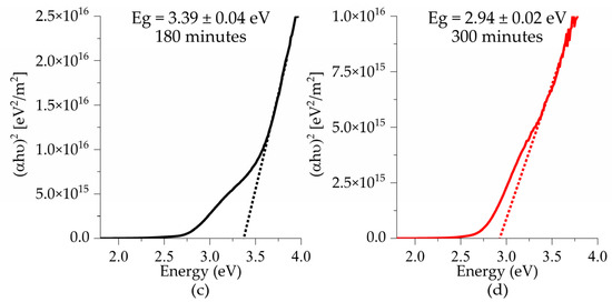Figure 9 presents the band gap values for all samples deposited on glass substrates as a function of deposition time. A decrease in the band gap is observed as the deposition time increases. For films treated at 575 °C, the obtained values were 3.39 eV at 180 min, and 2.94 eV at 300 min, which is consistent with the findings reported by Sando et al., who attributed this trend to the increase in film thickness due to changes in the microstructure and a reduction in surface defects, both of which contribute to a decrease in the values of the band gap [29]. As the thermal treatment temperature increases from 550 to 575 °C, a decrease in the band gap from 3.25 eV to 2.94 eV is observed for samples with a deposition time of 300 min. This can be attributed to an improvement in the crystallization process, which results in a more ordered atomic arrangement, thereby narrowing the band gap [32].