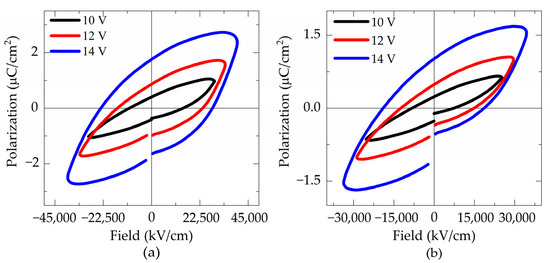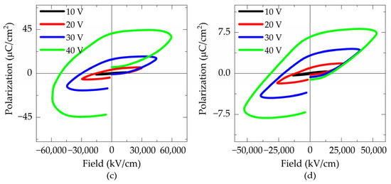 Figure 10c,d present the hysteresis loops of thin films deposited for 300 min on ITO. Both ITO550/300 and ITO575/300 films exhibit similar loop shapes. The film treated at 550 °C achieved a maximum saturation polarization of 40.89 μC/cm2 and a remanent polarization of 44.87 μC/cm2, representing the highest values obtained. In contrast, the film treated at 575 °C exhibited a maximum polarization of 8.45 μC/cm2 and a remanent polarization of 6.68 μC/cm2.