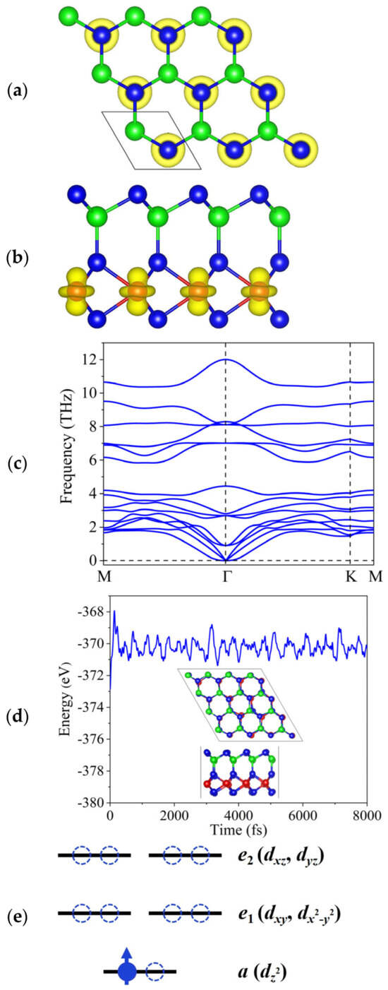 The (a) top and (b) side views of monolayer TiAlTe3 along with the spin charge density. The blue, green, and red balls represent Te, Al, and Ti atoms, respectively. (c) The phonon dispersion of monolayer TiAlTe3. (d) The AIMD of monolayer TiAlTe3 at 300 K. (e) The splitting of Ti-3d orbitals under trigonal prismatic crystal field.