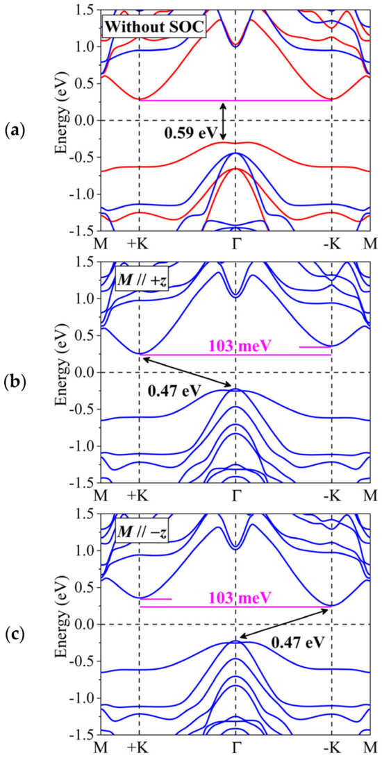 Here, and () are the energy of the valley in the bottom conduction band and the spin symbol, respectively. Secondly, as shown in Figure 2a, when the SOC effect is excluded, the identical spin symbol in the +K and −K valleys is forced by spin-polarized effect; that is,