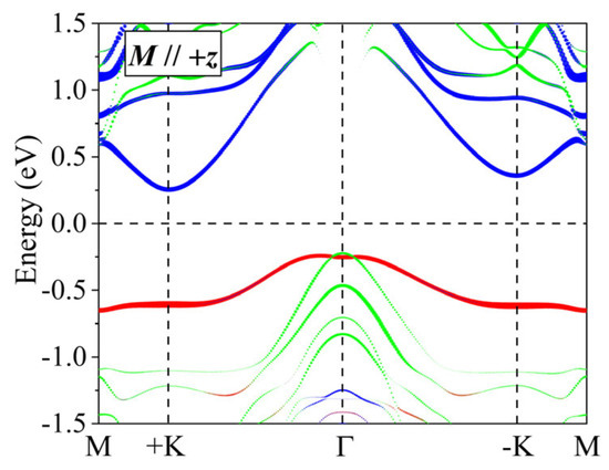 Significantly, the magnetization orientation can be varied from IP to OP under an external magnetic field. According to Figure 2b, monolayer TiAlTe3 still shows indirect semiconductor properties, and the band gap is 0.47 eV. The SOC negates the degeneracy between +K and −K valleys in the bottom conduction band, and spontaneous valley polarization equal to 103 meV is induced in monolayer TiAlTe3. This corresponds to employing an enormous external magnetic field of about 515–1030 T. The valley polarization of 103 meV is superior to that of numerous other FV systems discovered, such as ScBrI (90 meV) [15], VCGeN4 (46 meV) [17], and LaBrI (59 meV) [19]. According to Figure 2c, when monolayer TiAlTe3 is magnetized toward a −z orientation, the valley polarization and spin are concurrently reversed. The valley states in monolayer TiAlTe3 can be regulated by transforming its magnetization orientation.