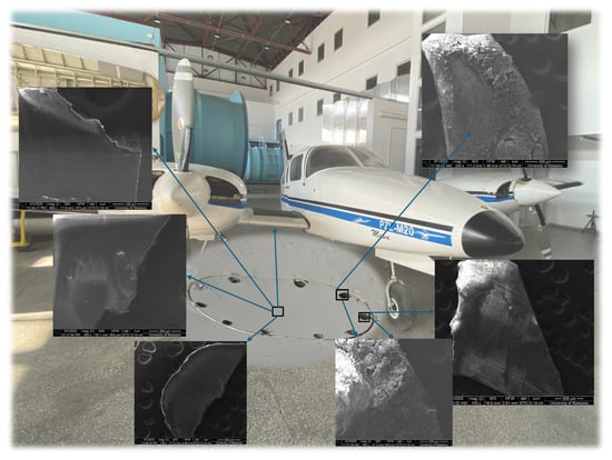 Paint blistering and dark streaks around rivet heads (Figure 1 are common indicators of damage caused by galvanic corrosion, moisture ingress, vibration, mechanical cleaning, and material aging [4,5,6,7,8,9,10,11,12].