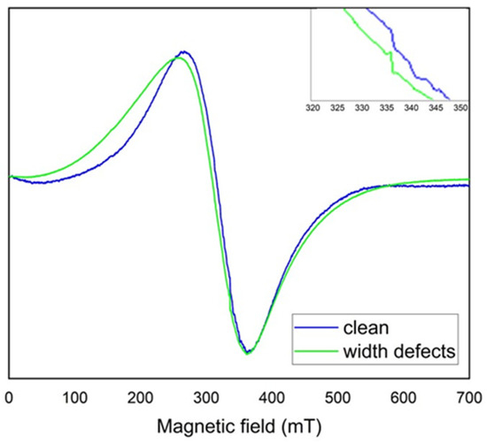 Analyzing the obtained values, it can be observed that the EPR spectrum of the paint with defects has broadened (Hpp) along with a slight shift towards a lower field. This is clearly visible in Figure 7. The main contributor to this broadening is the second component (Gaussian line 1.2), which can be seen in Table 2. This component undergoes broadening and a shift towards a lower field. Further analysis should enable the determination of paint wear and air contamination that contributed to this wear. To this end, the following EPR studies should be conducted in the subsequent analysis: calculation of the total number of spins, determination of the spin Hamiltonian of the observed lines.