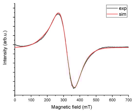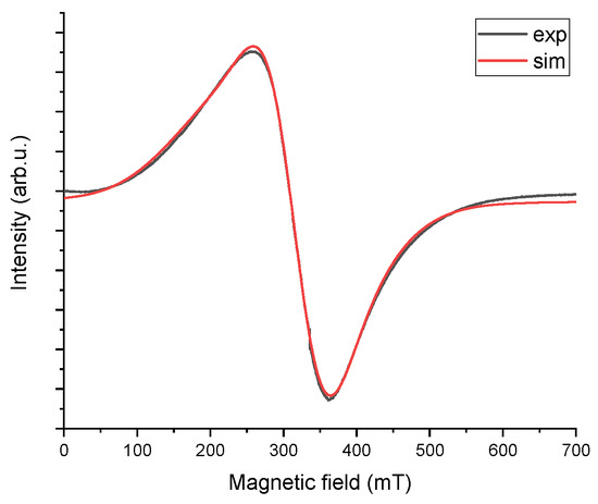 Two lines can be observed—a primary, broad line around 300 mT, with a peak-to-peak width of approximately 100 mT, and a very small one at an effective g factor around 2, located near 350 mT (see inset of Figure 5). Additionally, a broadening of the green line can be seen, along with a slight shift towards a lower field. The differences in the shape of the two lines indicate paint wear and contamination causing degradation of the coating near the mounting holes of the PZL M-20 “Mewa” aircraft’s surface element. The difference in the line shape reveals altered properties of the paint sample marked as defects in Figure 3 compared to the pristine, undamaged surface. A comparison was made between the actual EPR spectra measurements and simulated spectra generated in the Easyspin program within the Matlab package. The EPR spectrum shows two lines (a narrow one originating from carbon) and one broad line, which consists of at least two components. The broad line was analyzed, and spectroscopic parameters were adjusted to fit the two components. The fit demonstrates a high correlation between the experimental spectrum and the simulated one, as shown in Figure 6 for the pristine sample and Figure 7 for the sample taken from near the rivet hole.