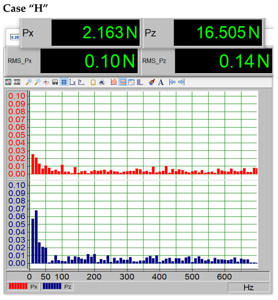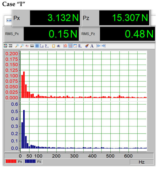 The fourth case of the study, indexed as “I” and shown in Figure 15, clearly demonstrates a fourfold increase in the RMS value of the Pz component. FFT spectrum analysis reveals that the Pz component is nearly 10 times higher than in the first case.