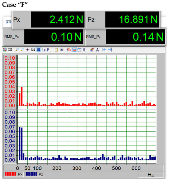 Spectrum and force magnitudes Px and Pz for the first case of paint coating loss (case F).