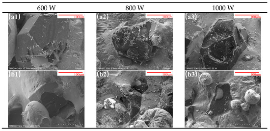 SEM characterization of diamond in cladding under laser powers of 600 W, 800 W, 1000 W. Subfigures (a1–a3) and (b1–b3) represent samples without and with LTLs, respectively.