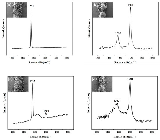 Figure 6a (with In718 LTL at 600 W laser power) exhibits a sharp diamond characteristic peak at 1332 cm−1 in the Raman spectrum, with no extraneous peaks, indicating an intact diamond lattice and no graphitization. In contrast, the sample without an LTL (Figure 6b) shows a distinct graphitization peak at 1580 cm−1 alongside the diamond peak, with an intensity ratio ID/IG = 0.326 [9], confirming partial surface graphitization of the diamond. At 800 W laser power, the transition-layer sample (Figure 6c) displays enhanced intensity and sharper profile of the 1332 cm−1 peak compared to the 600 W group, with no graphitization peaks, suggesting improved diamond-matrix interfacial bonding without thermal damage. Conversely, the non-transition-layer sample (Figure 6d) exhibits significantly intensified graphitization peak intensity (ID/IG = 0.415) and a defect-induced D’ peak at 1350 cm−1 [18], indicating accelerated structural defects and phase transitions under high-temperature molten pool conditions. For transition-layer samples at 600 W and 800 W, the increased 1332 cm−1 peak intensity and narrowed peak width demonstrate that higher laser power enhances diamond–binder interfacial bonding without inducing thermal degradation. However, in non-transition-layer samples, the ID/IG ratio rises from 0.326 to 0.415 with increasing power (600 W → 800 W), accompanied by the emergence of the D’ peak, which reflects intensified graphitization due to elevated molten pool temperatures.