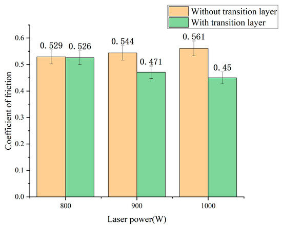 To investigate the influence of the LTL on the tribological properties of laser-clad diamond composites, the coefficient of friction tests were conducted on samples without and with LTLs under different laser power conditions (800 W, 900 W, and 1000 W). Results are shown in Figure 9.