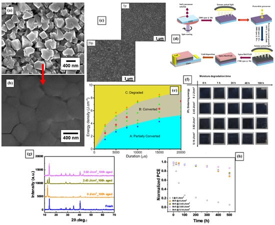 PS-sintered perovskite films showed improved moisture stability, maintaining their morphology and photoelectric conversion efficiency (PCE) under high humidity conditions, portrayed in Figure 2f–h. As demonstrated by Peng et al., perovskite films sintered at 3.92 J· showed almost no signal of PbI2 after 100 h in a 70% relative humidity environment []. PS enhances crystallinity and reduces defects in the perovskite film, while substantially reducing the fabrication time and costs. These factors are crucial for improving the overall efficiency and stability of solar cells [].