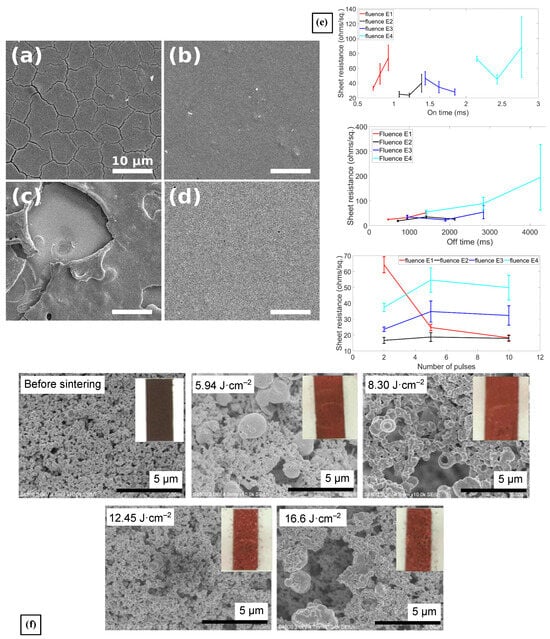 The effects of PS in copper sulfide (CuxS, x = 1 to 2) thin films were studied for the first time by Bansal et al. The film’s dominant crystalline phase, covellite or digenite, was determined by the post-processing conditions, and thus, its possible applications ranging from absorbers to solar cells and thin-film electronics []. Indeed, at a fixed number (5) of pulses, different concentrations of the digenite (Cu1.8S)–covellite (CuS) mixed phases were obtained at lower pulse fluence values (5 and 7.5 J·), and at higher fluence values (10 and 15 J·), there was a phase transformation from a mixed covellite–digenite to a pure digenite phase, as a result of the increased film temperature. A similar behavior was measured when increasing the ON/OFF ratio of the pulse (duty cycle) as longer ON times also result in elevated heating of the film. Conversely, longer OFF times meant more cooling of the film in between pulses, which limited its heating, and thus, more control over the mixed phases. Interestingly, a higher number of pulse repetitions leaving every other condition fixed yielded higher concentrations of covellite over digenite. As expected, higher digenite/covellite ratios meant higher sheet resistance in the films. In contrast, retention of the covellite phase while increasing the grain growth resulted in better electrical performance, which was then correlated to the variation of the PS parameters to find the optimal processing conditions, whose impacts in the sheet resistance of the film is shown in Figure 4e. A reduction of nearly 99% in the of the films was observed when processed at 7.5 J·, 3 pulses, and ON/OFF times of 1.215/761 ms (0.159% duty cycle), when compared with the as-deposited film with = 3.66 k· []. This work strongly highlights the versatility of PS showing a flexibility that is non-existent with traditional oven sintering methods.