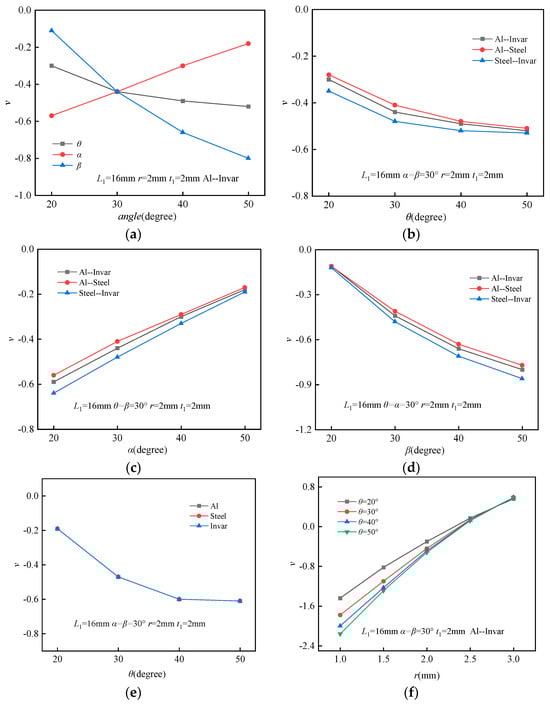 To examine the effect of the angle θ on the PR under varying material combinations, the geometric parameters of the BTBM were fixed at L1 = 16 mm, α = β = 30°, t = 0.4 mm, t1 = 2 mm, and r = 2 mm, while θ was varied at 20°, 30°, 40°, and 50°. Three material systems were systematically investigated in this work: Al–Invar, Al–Steel, and Steel–Invar bi-material combinations. The FEA results, presented in Figure 5b, reveal that the ν values for the three material combinations are remarkably similar, indicating that ν is largely independent of the material composition. As θ increases, ν gradually decreases, reaching its maximum negative value at θ = 50°.