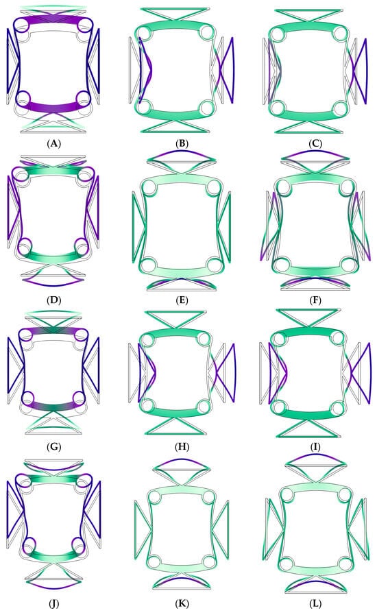 To further elucidate the underlying formation mechanism of the band gap within the band structure, an analysis was conducted on the vibration modes at points B, O, and A, located at the upper and lower boundaries of the first band gap. As illustrated in Figure 8, the vibration modes at points A, G, M, and S are characterized by upward tensile deformation of the upper bi-material triangle, upward compressive deformation of the lower bi-material triangle, inward compressive deformation of the left and right bi-material triangles, and an overall upward movement of the structure. The vibration modes observed at points B, C, H, I, N, O, T, and U are dominated by the right compression curved beam deformation of the left bi-material triangle and the right extension curved beam deformation of the right bi-material triangle. The vibration modes at points D, J, P, and V are mainly manifested as downward compression deformation of the upper bi-material triangle and downward tensile deformation of the lower bi-material triangle. The analysis further revealed that the vibration modes at points E, K, Q, and W are primarily characterized by upward tensile deformation of the upper bi-material triangle and upward compression deformation of the lower bi-material triangle. Additionally, at points F, L, R, and X, the vibration modes exhibit not only the aforementioned tensile and compressive deformations but also rotational deformation of the left and right triangles.