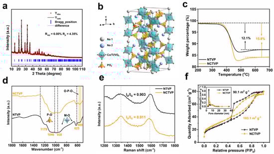 (a) XRD Rietveld refinement pattern of NCTVP; (b) schematic crystal structure of NCTVP; (c) TGA curves; (d) FT-IR spectra; (e) Raman spectra; (f) N2 adsorption–desorption isotherms and corresponding pore size distribution curves of NCTVP and NTVP.