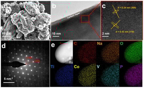 (a) SEM; (b) TEM; (c) high−resolution TEM; (d) SAED pattern; (e) EDS elemental mappings of NCTVP.