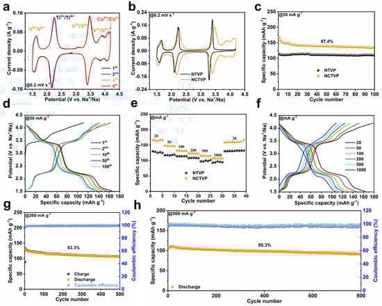 The sodium storage performances of NCTVP and NTVP are assessed by galvanostatic charge–discharge (GCD) and cyclic voltammetry (CV). The CV curve of NCTVP displays five pairs of redox peaks located at 4.12/4.01, 3.90/3.84, 3.46/3.40, 2.24/2.17, and 1.62/1.56 V, which are from the Co2+/Co3+, V4+/V5+, V3+/V4+, Ti3+/Ti4+, and V2+/V3+ redox couples, respectively (Figure 3a). The overlapping CV curves indicate the highly reversible intercalation/de-intercalation of Na+. In contrast, the CV curve of NTVP (Figure 3b and Figure S3) shows only three pairs of redox peaks from the V3+/V4+ (3.40/3.27 V), Ti3+/Ti4+ (2.23/2.12 V), and V2+/V3+ (1.67/1.56 V) couples. Compared to NTVP (Figure 3b), the CV curve of NCTVP exhibits two additional redox peaks (3.90/3.84 and 4.12/4.01 V). The appearance of the redox pair at 3.90/3.84 V suggests that Co doping activates the V4+/V5+ redox []. The activation of the V4+/V5+ redox reaction may result from Co-doping-facilitated electronic rearrangement in the material [,]. Figure 3c presents the cycling performances of NCTVP and NTVP at 50 mA g−1. For NCTVP, the discharge capacity reduces from 154.1 to 134.7 mAh g−1 in 100 cycles, achieving a retention of 87.4%. The high discharge capacity of NCTVP signifies a multi-electron redox process involving 2.8 electron transfers per formula unit. In contrast, NTVP retains a capacity of 110.8 mAh g−1 over 100 cycles, significantly lower than NCTVP. However, the retention of NTVP is slightly higher than NCTVP, which might be caused by the severe contraction of the crystalline structure during the oxidation of V4+ to V5+. The GCD curve (Figure 3d) of NCTVP shows a slope between 4.2 and 3.5 V from the Co2+/Co3+ and V4+/V5+ redox couples. The plateaus observed at 3.4 and 2.2 V are attributed to the V3+/V4+ and Ti3+/Ti4+ redox couples, respectively. The short slope after 2.2 V corresponds to the V2+/V3+ redox couple. In contrast, NTVP does not exhibit a discharge plateau in the 4.2–3.5 V region (Figure S4), consistent with its CV curve. Figure S5 presents the cyclability and GCD curves of NCTVP at 100 mA g−1. NCTVP maintains a capacity of 116.2 mAh g−1, with a capacity retention of 88.9% over 200 cycles. Compared to NTVP, NCTVP demonstrates superior rate performance (Figure 3e,f and Figure S6).