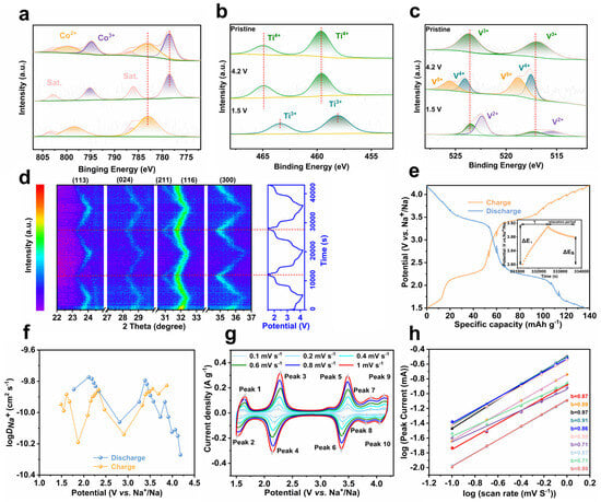 (a) Co 2p, (b) Ti 2p, and (c) V 2p XPS spectra; (d) in situ XRD patterns of NCTVP; (e) GITT curve; (f) Na+ diffusion coefficient of NCTVP; (g) CV plots of NCTVP at different scan rates; (h) log (peak current) as function of log (scan rate).