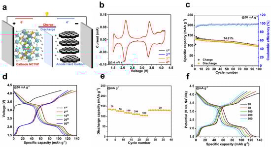 (a) Schematic diagram of NCTVP//HC full cell; (b) CV curves at 0.4 mV s−1; (c) cycling performance at 50 mA g−1; (d) GCD curves at 50 mA g−1; (e) rate performance; (f) GCD curves at different current densities.