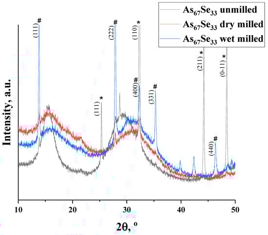 Part of the preliminary dry-nanomilled alloy was additionally subjected to wet nanomilling in 300 mL of a 0.5% PVP (polyvinylpyrrolidone) water solution using a MiniCer mill (Netzsch, Selb, Germany). PVP of 40,000 g·mol−1 weight purchased from Sigma-Aldrich Co., LLC (St. Louis, MO, USA) was used. This 90 min processing was performed at 3500 min−1 speed under 85% loading of the milling shaft with yttrium-stabilized ZrO2 balls. After wet milling, the nanosuspension was dried at 70 °C and pelletized under ~0.7 GPa, producing a PVP-capped As4Se2 nanocomposite. In this As4Se2/PVP nanocomposite, the ‘crystalline’ lines of the As2O3 phase grow in intensity and become broader than those of the elemental As phase, and the arrangement of diffuse peak halos ascribed to the amorphous phase attains a character of irregularity for bulky glassy arsenoselenides [12]. Similar pellets were also fabricated from the PVP solution subjected to nanomilling to serve as a reference in calorimetric measurements for wet-nanomilled As4Se2 specimens.