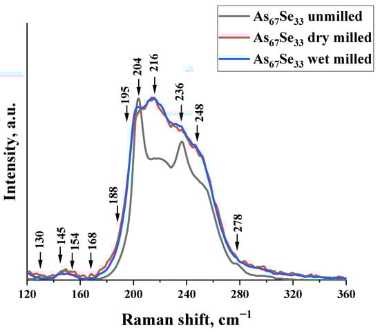 These fine features are also well observable in the micro-RS spectra of dry and dry–wet-nanomilled specimens (see Figure 2, red and blue curves), but they are essentially broadened and obscured as compared with the micro-RS spectrum of the unmilled As4Se2 alloy. This finding is in line with the most generalized nanostructurization-driven amorphization trends in over-stoichiometric arsenoselenides [12]. Molecular-to-network transformations occur in these substances owing to the destruction of thioarsenide-type molecular entities, proceeding with incorporation of their remnants in a newly polymerized arsenoselenide network undergoing polyamorphic (amorphous-I-to-amorphous-II) transitions [11,12].