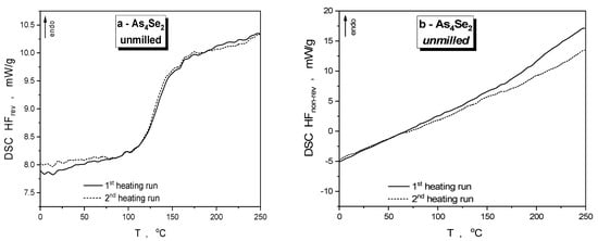 The specimens of As4Se2 alloy affected by defects generated under high-energy nanomilling become notably stressed, enhancing the calorimetric heat-transfer response as compared with the as-prepared (unmilled) specimens derived by melt-quenching. The DSC-TOPEM profiles depicted in Figure 3a,b specify temperature variations of reversing (HFrev) and non-reversing (HFnrev) heat flow collected in the first and second heating runs in this alloy, and respective parameters of the DSC profiles are gathered in Table 2.