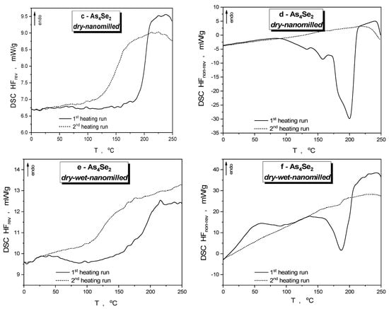 Temperature variations of the reversing (HFrev) and non-reversing (HFnrev) heat flows collected in the first and second heating runs in the dry-nanomilled As4Se2 alloy additionally subjected to wet milling (in the 0.5% PVP water solution) are depicted by the DSC-TOPEM profiles reproduced in Figure 3e,f. The essential difference of this wet-nanomilling-driven calorimetric response from that caused by dry-nanomilling is obvious even from visual inspection of these heat flow variations. In PVP-capped nanocomposite fabricated by wet milling (that is As4Se2/PVP nanocomposite), a broad endotherm peaking at ~40 °C and stretching to almost ~100 °C appears in the first heating run in the HFrev(T) dependence before a Tgonset-related steplike jump at ~179.4 °C associated with ΔCp~0.13 J·g−1·K−1 (see Table 2). In non-reversing heat flow determination (see Figure 3f), this event is revealed as a smoothly growing endotherm in the (0–100) °C range with ΔH~25.6 J·g−1 followed by a strong asymmetric exotherm in the (130–200) °C range peaking at ~180 °C with ΔH~53.4 J·g−1 (see Table 2). After the first cooling run, the wet-milled specimen is rejuvenated, returning almost completely to its initial state free of residual mechanical stress. Thus, the glass transition temperature in this As4Se2/PVP nanocomposite derived from HFrev(T) dependence (see Figure 3e) returns back to Tgonset~112.4 °C with heat capacity variation ΔCp~0.11 J·g−1·K−1 (see Table 2), while the HFnrev curve reproduced in Figure 3f demonstrates a smoothly growing endothermic tendency without any notable peaks.
