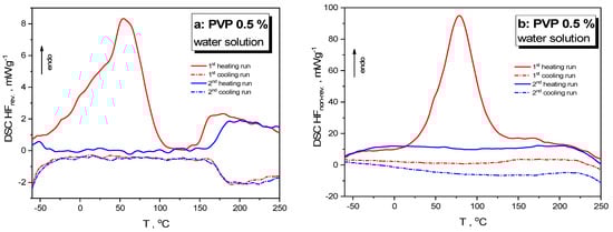 Methodologically, the calorimetric measurements were arranged in two cycles, including subsequent heating–cooling runs within the (0–250) °C range. During the first heating run, when the calorimeter reached the maximum temperature of 250 °C, the cooling run towards 0 °C was started immediately under a constant rate approaching −5 K·min−1. After the completion of this heating–cooling cycle, the sample was kept at 0 °C for about 15 min, and then a second heating run was started under conditions identical to those in the first run. The processing of the collected data was adjusted using a sapphire reference spectrum, with the calculation window set to a width of 60 s and a shift interval of 1 s. In case of reference PVP probes, the measurements were performed under a preliminary temperature drop from 25 °C to −60 °C and then continued within subsequent heating–cooling runs (1 K/min) between −60 °C and 260 °C. Mathematical processing of the data was carried out using a calculation window with a width of approximately 120 s and a shift increment of 2 s.