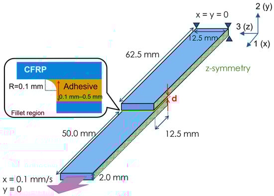 Overview of the finite element model geometry and boundary conditions. Displacement was given in the direction of the arrow. A fillet radius of 0.1 mm was applied at the adhesive edge to reduce stress concentration, and the adhesive thickness was varied from 0.1 mm to 0.5 mm.